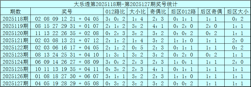 体彩大乐透第25127期奖号为:04 05 19 28 29+05 08,前区奖号012路比为0:3:2,奇偶比为3:2,大小比为3:2,后区为全2路号码。