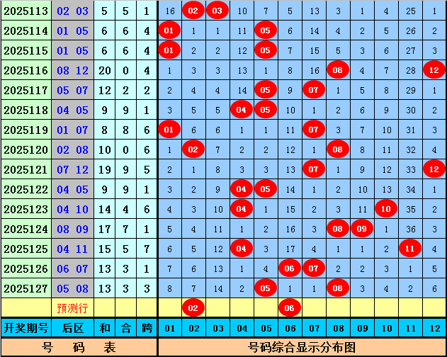 后区分析:上期后区开出奖号05、08,为一大一小、一奇一偶组合。