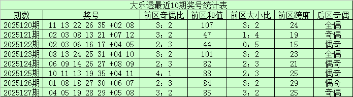 大乐透第25127期奖号为:04、05、19、28、29+05、08。其中前区和值为85,奇偶比为3:2,大小比为3:2。后区为一大一小、一奇一偶组合。