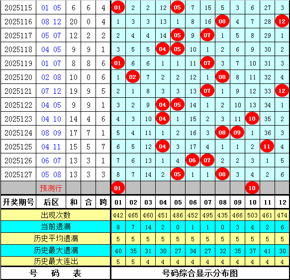后区一号球尾数:该位上期开出尾数5下降1点,最近5期该位尾数升平降走势为:平→升→降→升→降,前10期尾数升平降比例为4:5:1,前30期尾数升降平比例为12:14:4,本期预计该位尾数下降,参考尾数1。