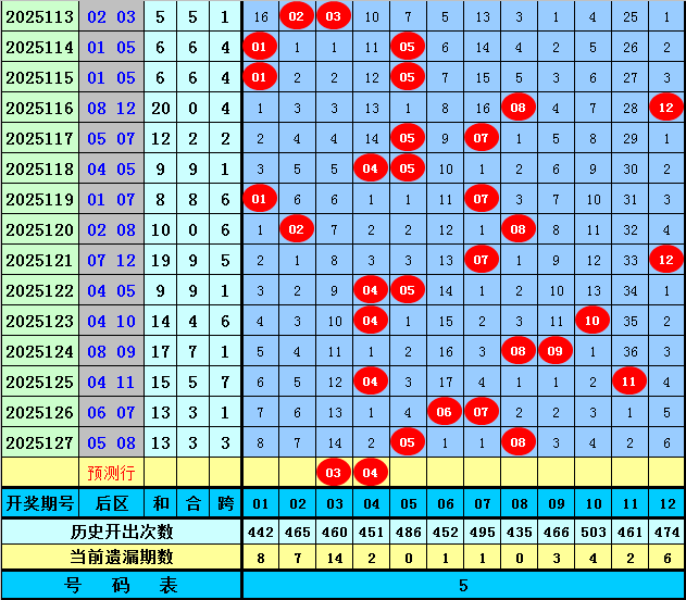 后区第一位推荐:在连续5期开奖中分别出号:04、08、04、06、05,均值为5.4,其中奇数奖号表现较冷,本期适当关注回补,参考奇数号码03。