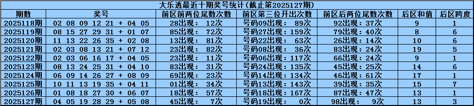 后区奖号分析:上期后区开出奖号05+08,奖号和值为13,跨度为3,本期预计后区和值转小,关注两码02 06。