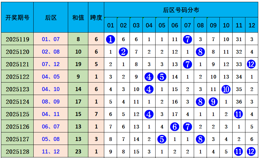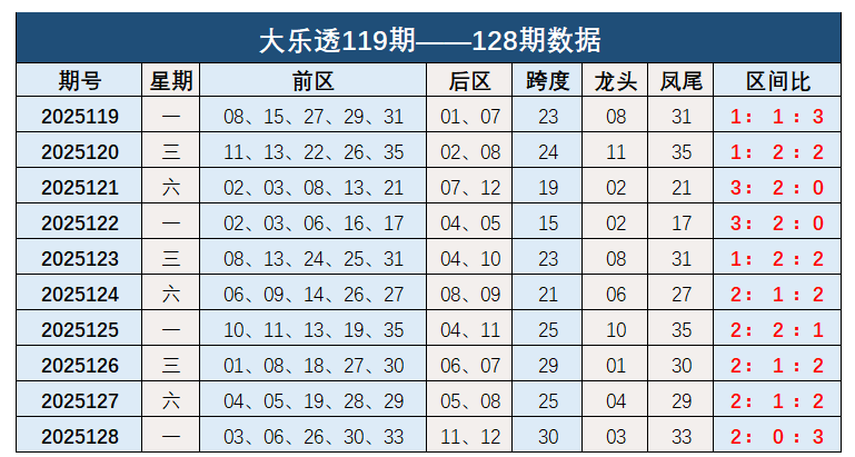大乐透第2025128期出奖号统计:前区03、06、26、30、33,后区11、12。前区跨度30,龙头03,凤尾33,区间比比2:0:3。