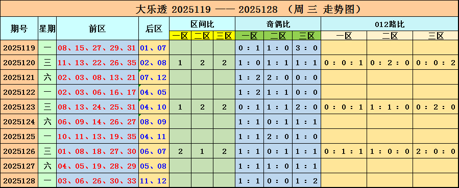 前第三区(25-35):上期该区开出3个26、30、33,上周三该区开出2个奖号27、30,最近10期该区开出17个奖号,最近10期星期三该区出现6个奖号,近10期断区2次,近10期星期三断区0次,本期注意该区落号,排除断档。最近10期该区奇偶比为11:6,其中星期三分别开出奇偶比为1:1、2:0、1:1,奇数号码相对热出。最近10期星期三该区号码012路比为2:2:2,本期该区号码重点关注2码:28、33。