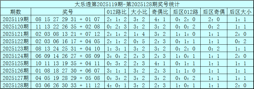 体彩大乐透第25128期奖号为:03 06 26 30 33+11 12,前区奖号012路比为4:0:1,奇偶比为2:3,大小比为3:2,后区1路号码轮空。