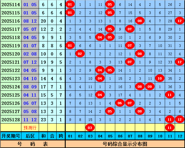 后区号码分析:第129期历史同期开奖中,后区两码全小开出5次,一大一小开出11次,全大开出1次,本期后区预计出现一大一小奖号,参考号码03、06、10、11。