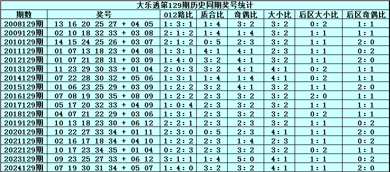 体彩大乐透第2025129期历史同期开奖号码分析:
