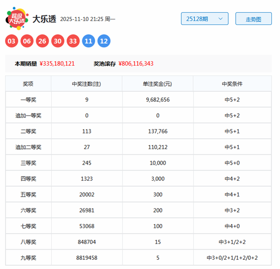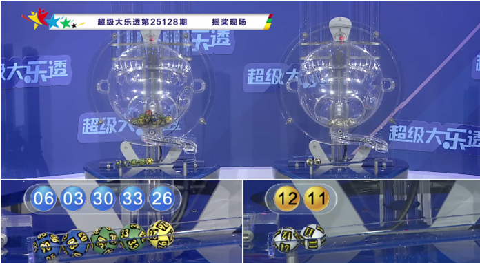 上期开奖:体彩大乐透第2025128期开奖号码为:03 06 26 30 33 + 11 12。