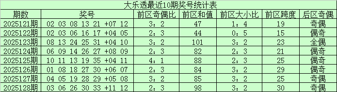 大乐透第25128期奖号为:03、06、26、30、33+11、12。其中前区和值为98,奇偶比为2:3,大小比为3:2。后区开出全大、一奇一偶组合。