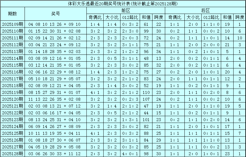 其中前区奖号大小比为43:57,012比为37:28:35,奇偶比为50:50,跨度出现范围在13-34区段,和值出现范围在44-110区间。