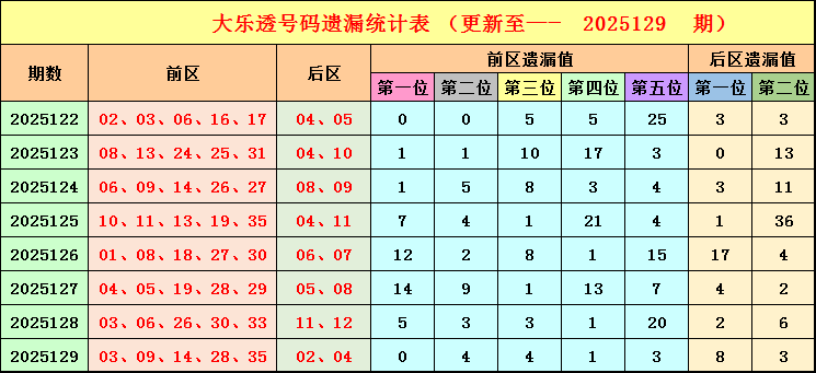 前第三区(25-35):上期该区开出2个28、35,分别遗漏1期、3期。最近8期该区开出14号码,分别遗漏17期、3期、3期、4期、4期、1期、15期、13期、7期、3期、1期、20期、1期、3期,其中,遗漏5期及以上的号码出现5个,5期以下的号码出现9个。本期该区号码关注26、32。