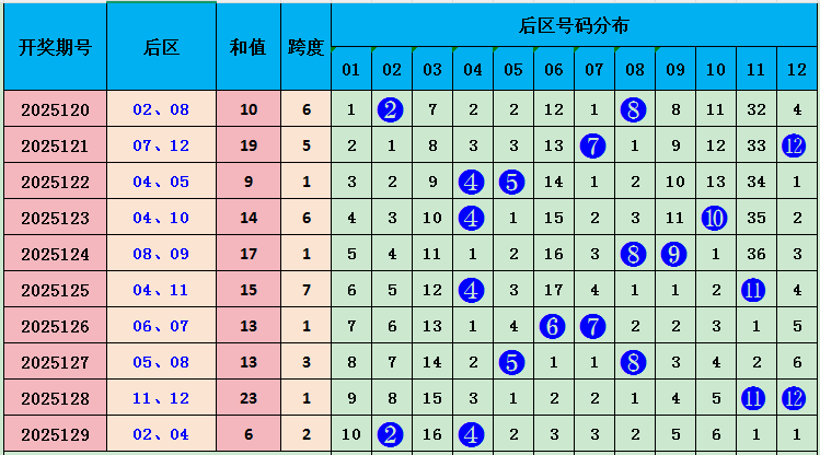 后区第一位:前10期开出奖号:其中奇数号码开出3次,偶数号码开出7次,奇偶走势偶数占优,本期注意奇数号码出现。参考号码:05。