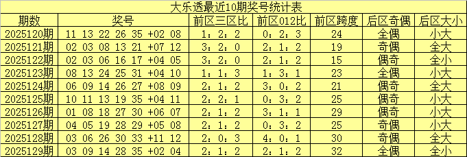 大乐透第2025129期奖号开出:03 09 14 28 35 +02 04。其中前区三区比为2:1:2,012路比为2:1:2,后区开出全小、全偶奖号。