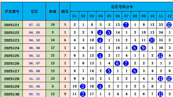 上期后区中奖号码为02 11,近10期后区综合奇偶比8:12,偶数出号占优,本期推荐偶偶组合04,10。