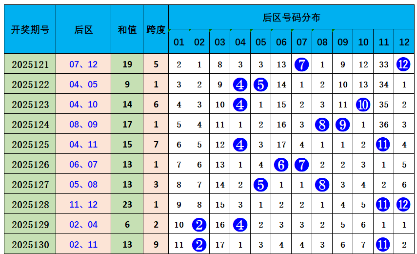上期后区开出奖号02、11,奇偶比1:1,近10期奇偶比8:12,偶数奖号开出较热,本期推荐奇偶比2:0,参考后区号码01、09。