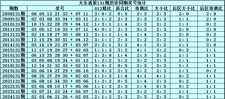 体彩大乐透第2025131期历史同期开奖号码分析: