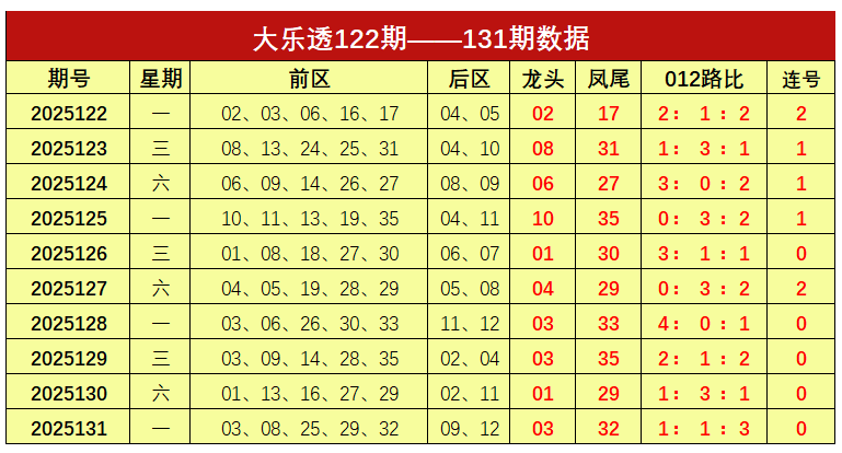 谢涛大乐透第2025132期本期推荐: