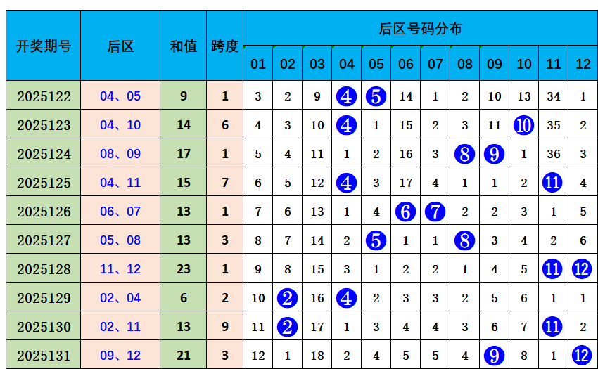上期后区开出奖号09、12,奇偶比1:1,近10期奇偶比8:12,偶数奖号开出较热,本期推荐奇偶比1:1,参考后区号码06、07。