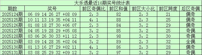 大乐透第25131期奖号为:03、08、25、29、32+09、12。其中前区和值为97,奇偶比为3:2,大小比为3:2。后区开出全大、一奇一偶组合。