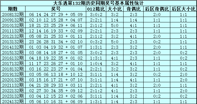 前区大小比推荐:第132期历史同期奖号中,号码大小比总比例为45:40,其中大小比0:5→0次、1:4→5次、2:3→3次、3:2→4次、4:1→3次、5:0→2次,开出比例较高,本期注意大号再次热出,关注大小比3:2。