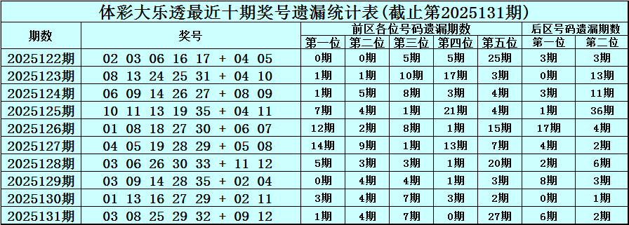 第2025131期奖号:03 08 25 29 32 + 09 12 ,各位号码遗漏期数为:1期、4期、7期、0期、27期 + 6期、2期。