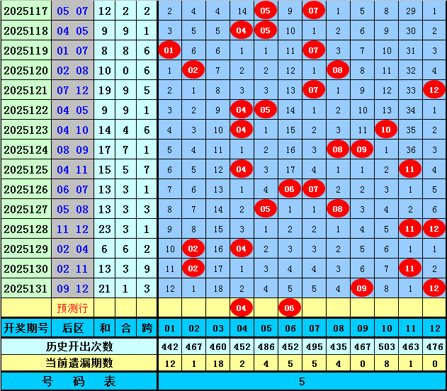 后区分析(定义:01-04为一区,05-08为二区,09-12为三区):上期后区开出奖号09和12,全在第三区出现,最近10期后区三个区间落号个数比为6:6:8,本期后区注意第一区和第二区号码出现,关注两码04、06。