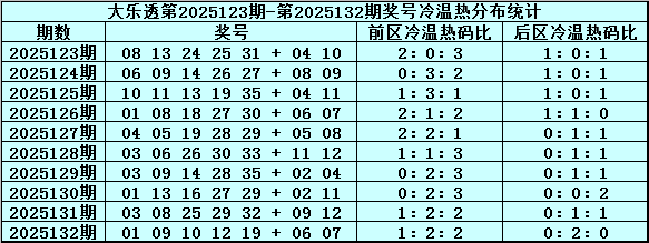体彩大乐透第25132期奖号为:01 09 10 12 19+06 07,前区奖号奇偶比为3:2,012路比为2:3:0,大小比为1:4,遗漏总值为26,后区号码遗漏总值为10。
