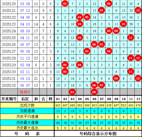 其中,后区012路比3:8:9,奇偶比6:14,大小比8:12,本期一码看好06。