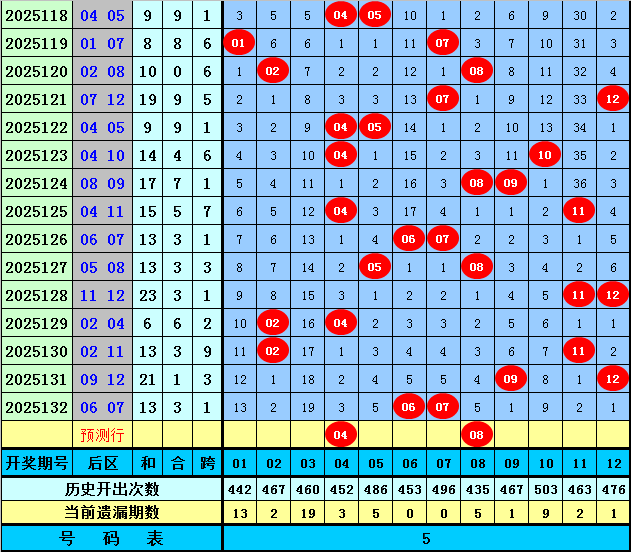 后区分析【一区01-04,二区05-08,三区09-12】:上期后区奖号为06和07,全部出现在第二区,近50期后区三区比为34:34:32,近10期三区比为5:7:8,本期注意第一、二区号码出现,关注两码04+08。