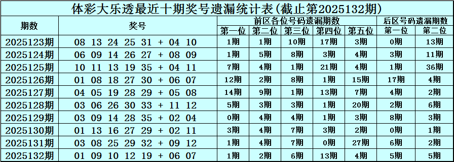 第2025132期奖号:01 09 10 12 19 + 06 07 ,各位号码遗漏期数为:1期、2期、6期、13期、4期 + 5期、5期。