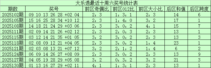 大乐透第2025132期开奖号码为:01、09、10、12、19+06、07。其中前区奖号首尾间距为18,和值为51,奇偶比为3:2,大小比为1:4。