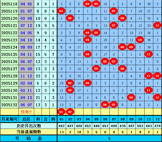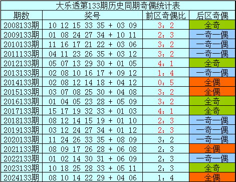 后区分析:在第133期历史同期开奖中,后区奖号奇偶比为18:16,最近5年同期后区奇偶走势为:一奇一偶、全偶、一奇一偶、全奇、全偶,今年同期看好奇偶号码同出,参考两码01、02。
