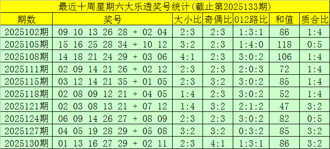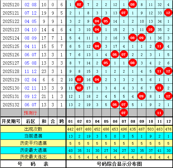 后区分析:最近10周星期六一大一小开出3次,全大开出3次,全小开出4次;一奇一偶开出6次,全奇开出1次,全偶开出3次,本期后区注意两码07+11。