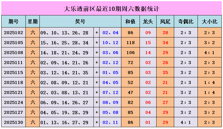 奇偶走势分析:上个周六前区奇偶比为4:1,最近10个周六中,奖号奇偶比为25:25,奇数、偶数走势相同,本期关注偶数比奇数出号多,推荐奇偶比:2:3