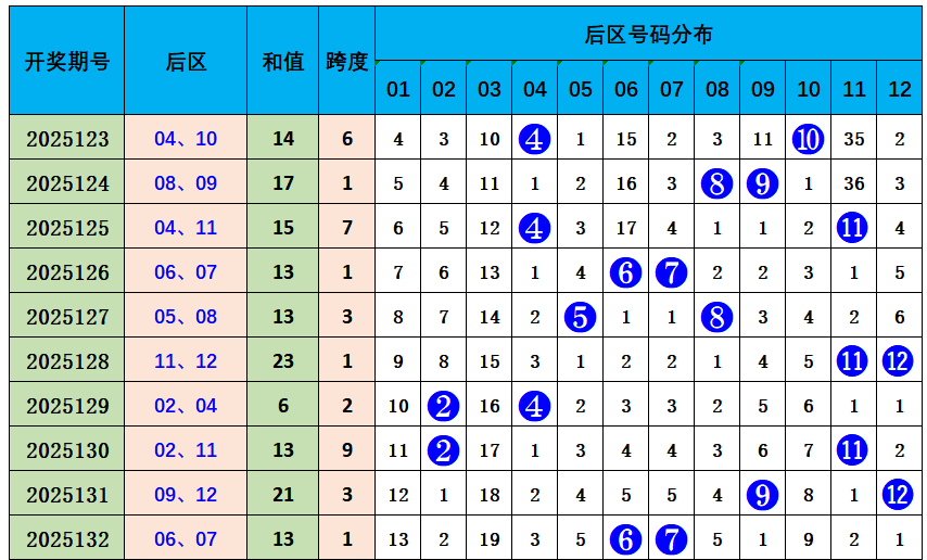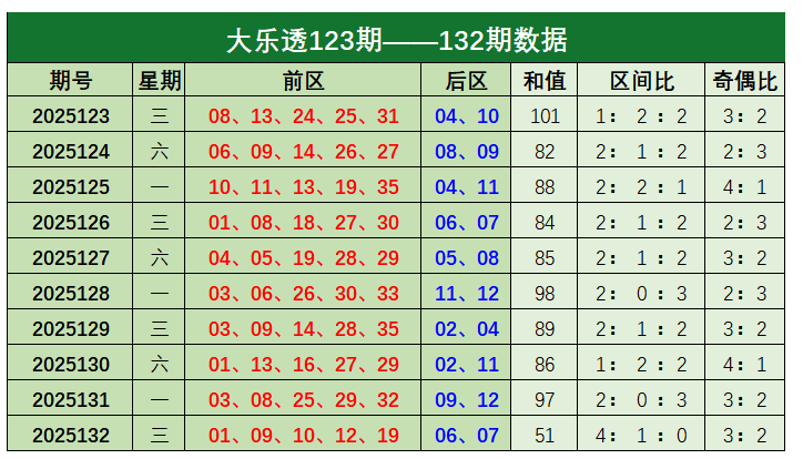 大乐透第2025132期出奖号统计:前区01、09、10、12、19,后区06、07。和值为51,区间比为4:1:0,奇偶比为3:2。