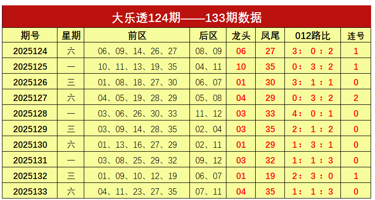 大乐透第2025133期出奖号统计:前区04、11、23、27、35,后区07、11。龙头04,凤尾35,012路比为1:1:3,未开出连号。