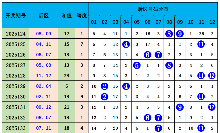上期后区开出奖号07、11,奇偶比2:0,近10期奇偶比10:10,奇偶数奖号开出均衡,本期推荐奇偶比1:1,参考后区号码01、02。