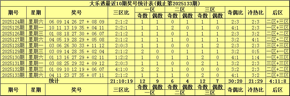 综上所述,大乐透第2025134期前区三区比看好1:3:1。