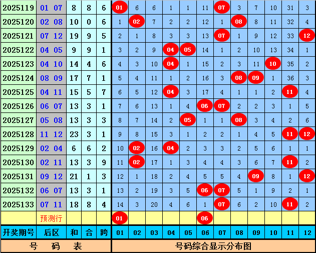 后区分析(一区01-04,二区05-08,三区09-12):上期后区开出奖号07和11,最近10期后区三区落号比为4:11:8,本期后区关注号码01、05、06、09、12,后区两码参考01、06。