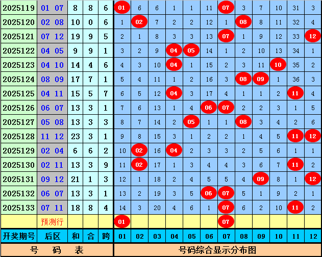 后区分析:上期后区开出号码07和11,最近10期后区奖号奇偶比为10:10,大小比为13:7,本期后区看好号码01、03、04、06、07,后区单挑两码01、07。
