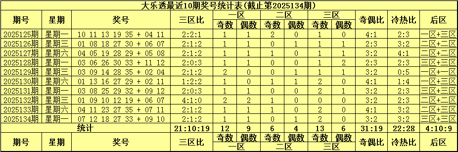 综上所述,大乐透第2025135期前区三区比看好2:2:1。