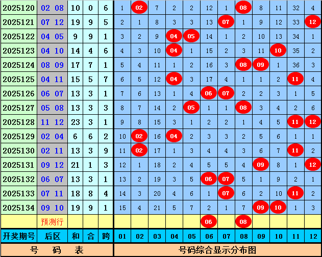 后区分析(一区01-04,二区05-08,三区09-12):上期后区开出奖号09和10,最近10期后区三区落号比为4:10:9,本期后区关注号码01、03、06、08、11,后区两码参考06、08。