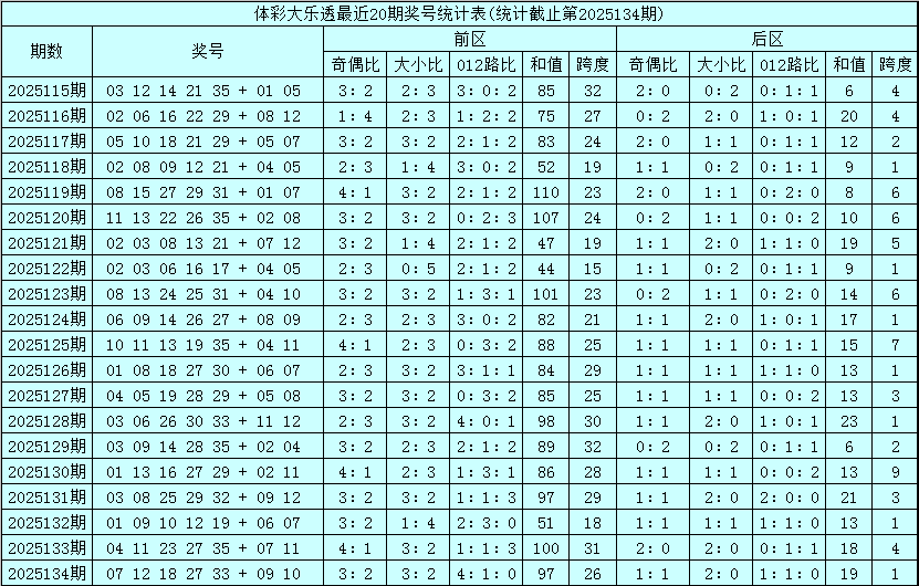 其中前区奖号大小比为45:55,012比为37:28:35,奇偶比为57:43,跨度出现范围在15-32区段,和值出现范围在44-110区间。