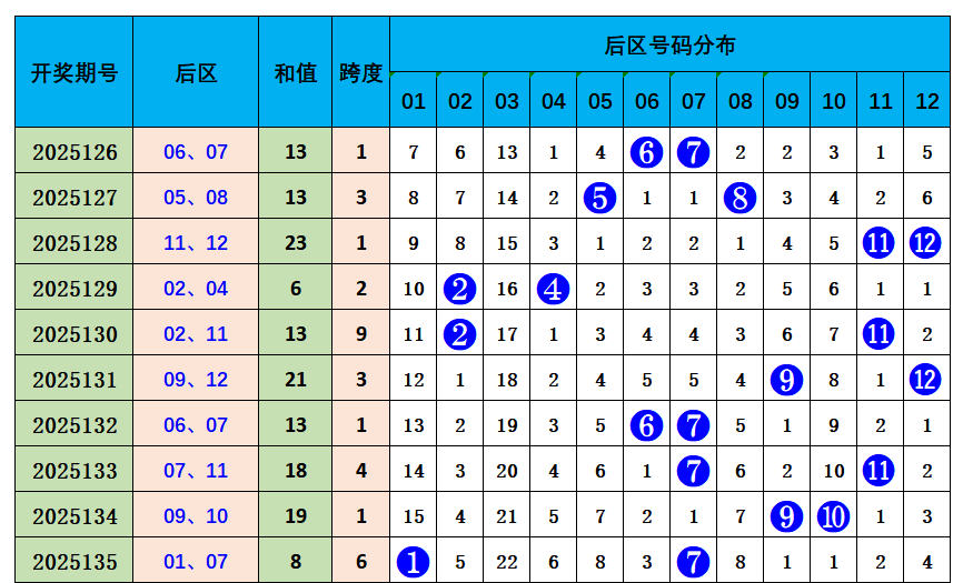 上期后区开出奖号01、07,奇偶比2:0,近10期奇偶比11:9,奇数奖号开出较多,本期推荐奇偶比0:2,参考后区号码04、08。