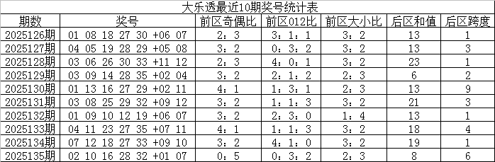 大乐透第25135期开奖,前区奖号:02、10、16、28、32;后区奖号:01、07。其中前区奖号012路比为0:3:2,大小比为2:3,奇偶比为0:5,后区开出1路+1路奖号。