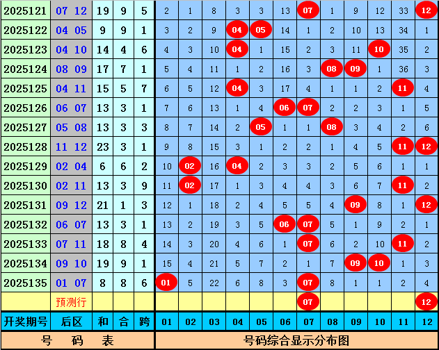 后区分析(一区01-04,二区05-08,三区09-12):上期后区开出奖号01和07,最近10期后区三区落号比为4:11:8,本期后区关注号码03、07、08、11、12,后区两码参考07、12。