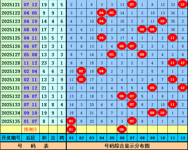后区分析:上期后区开出全1路号码01和07,最近30期后区奖号012路比为17:21:22,最近10期后区奖号012路比为6:7:7,本期后区注意号码01、05、06、07、09,单挑两码组合01、06。