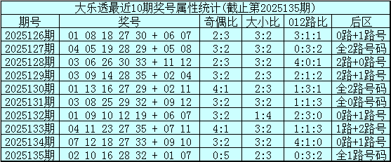 大乐透第2025135期开奖号码:02 10 16 28 32 + 01 07。前区奖号大小比为2:3,奇偶比为0:5,012路比为0:3:2,后区为全1路号码。