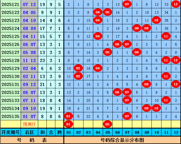 后区上期开出奖号01和07,该组合历史上出现了51次,其下期奖号频次分别为:号码10出现13次,02出现11次,09出现10次,07、08、11、12出现9次,01出现8次,04、06出现7次,05出现5次,03出现3次,本期后区参考号码01、02、05、06,精选两码01和05。