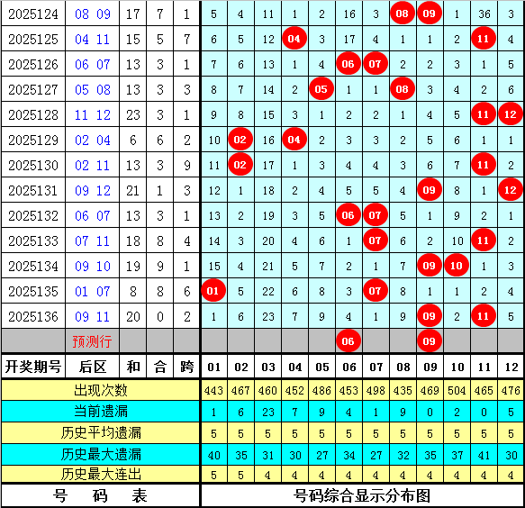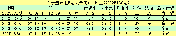 开奖回顾:体彩大乐透第25136期奖号为:07 11 15 16 23+09 11,前区奇偶比为4:1,大小比为1:4,和值为72,跨度为16,后区为全奇组合。